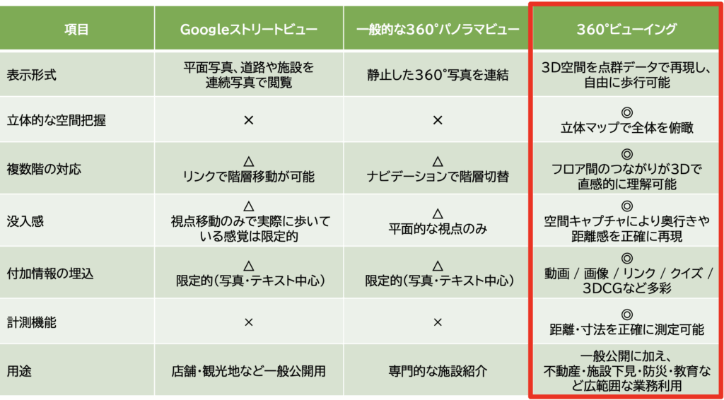 2025年11月12日 / 最終更新日時 : 2025年11月12日 a-train 紹介 TCN立体マップ作成サービス(360°ビューイング)のご紹介 今回は東京ケーブルネットワーク様が提供している「TCN立体マップ作成サービス(360°ビューイング)」をご紹介させていただきます。立体マップ作成サービス(360°ビューイング)とは、専用の機材で空間の3Dスキャンと360度画像の撮影を行い、正確な点群ウォークスルーデータを作成、PCやスマホ・VRゴーグル等で閲覧可能にするサービスです。 他社サービスとの違い Googleストリートビューや一般的な360°パノラマビューと違い、3Dでの空間キャプチャにより現実空間とほぼ同じ距離感での空間認識ができ、3D Showcase(ウォークスルー)で、コンテンツ内を自由に歩き回ることが可能です。 活用事例 (写真をクリックすると実際の360°ビューイングのページ・詳細サイトに遷移します) 東京ドーム・スタンド案内 野球殿堂博物館 旅館(鳳明館 森川別館) 防災シミュレーション 立体マップ作成サービスのメリット ■顧客体験の向上従来の写真や動画では伝わりにくい、空間の広がりや立体感、実際の雰囲気など、よりリアルに近い体験を顧客に提供できます。これにより、顧客は事前に具体的なイメージを持てるようになり、体験価値や満足度の向上につながります。■業務効率の向上とコスト削減現地に行かずともオンライン上で施設内部の確認や寸法確認ができ、現場確認の移動や時間を削減できます。また、クライアントに対しても下見や内見をオンライン上で実施できるため、ビジネスの効率が向上し、全体のコスト削減に繋がります。■施設の魅力の効果的なアピール独自性を活かしたPR空間の構造や導線をわかりやすく伝え、リアルに近い臨場感を表現することで、施設独自の魅力を効果的にアピールできます。これにより、他社にはない印象的なPRを展開し、差別化を図ることが可能です。 想定活用事例 ■美術館・博物館施設の紹介や期間限定展示イベントの記録に■展示会・ショールーム来場促進や出展者者向けのオンライン打ち合せ用に■企業HP上での会社施設紹介やリクルート向けの会社説明会に■神社・お寺・文化財建造物のアーカイブ用に■飲食店来店促進コンテンツや店内レイアウト見直し用に■ショップECサイトのバーチャルショッピングに 料金イメージ ■一般住宅(2階建て):77,000円〜■学校施設(学級数10程度):275,000円〜■美術館・博物館(延べ面積1,000㎡程度):385,000円~ 皆様のBtoB、BtoGビジネスにこの「TCN立体マップ作成サービス(360°ビューイング)」を活用されてはいかがでしょうか?「TCN立体マップ作成サービス(360°ビューイング)」に関するお問合せはhttps://taketheatrain.co.jp/#formからお問合せください。 コメントを残す コメントをキャンセルメールアドレスが公開されることはありません。 ※ が付いている欄は必須項目ですコメント ※ 名前 ※ メール ※ サイト 次回のコメントで使用するためブラウザーに自分の名前、メールアドレス、サイトを保存する。